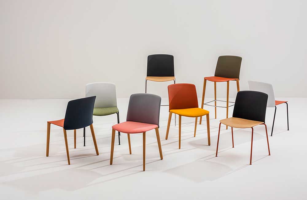 Il sedile, realizzato in plastica riciclata post industriale, è disponibile in diverse opzioni di colore, essenze in legno certificate FSC, finiture in tessuto o in pelle. È possibile abbinare i sedili a schienali in plastica – oppure rivestiti in tessuto o pelle – e alle basi a quattro gambe, sia in metallo che in legno certificato FSC.