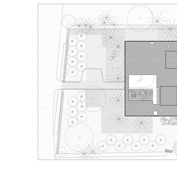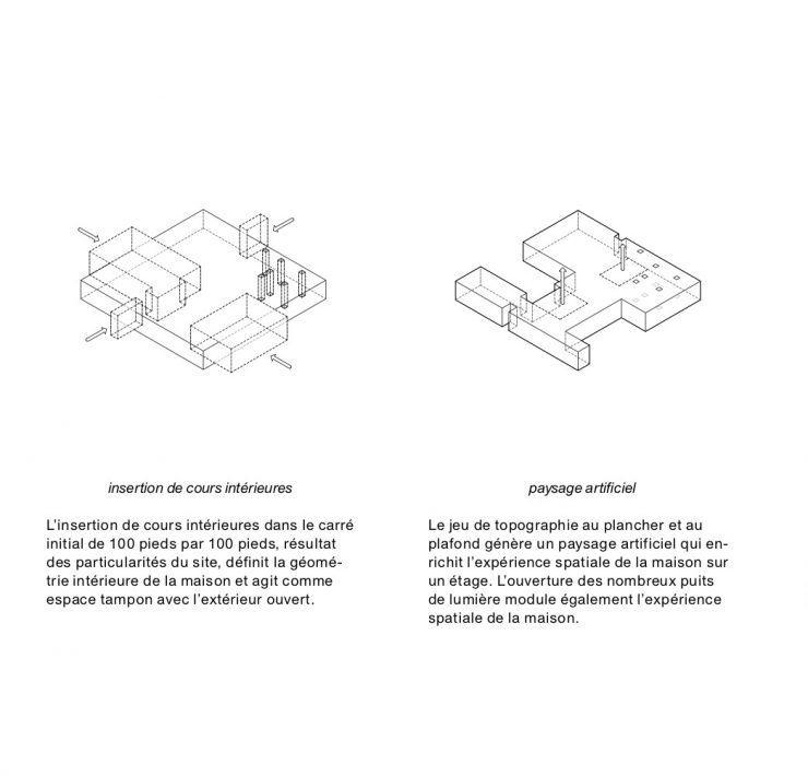 Due cortili rettangolari sono inseriti nel volume, portando la luce naturale nel cuore della residenza. Le aree esterne servono anche a definire e strutturare la geometria dello spazio interno del progetto. Il quadrato di 100 piedi è quindi in contatto con uno spazio esterno ordinato, posto in primo piano nel contesto naturale che rimane intatto oltre i confini della casa.
