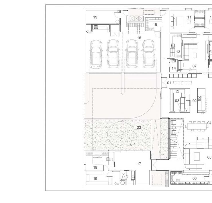 Rivisitando in modo contemporaneo alcuni elementi architettonici chiave del Moderno americano sono stati modellati pavimenti, soffitti, mobili, boiserie e rivestimenti. Il garage, simbolo dell’epoca in cui sobborghi e automobili facevano rima con progresso, è direttamente integrato nella casa, che così forma un perfetto quadrato di 100 piedi (30 metri).