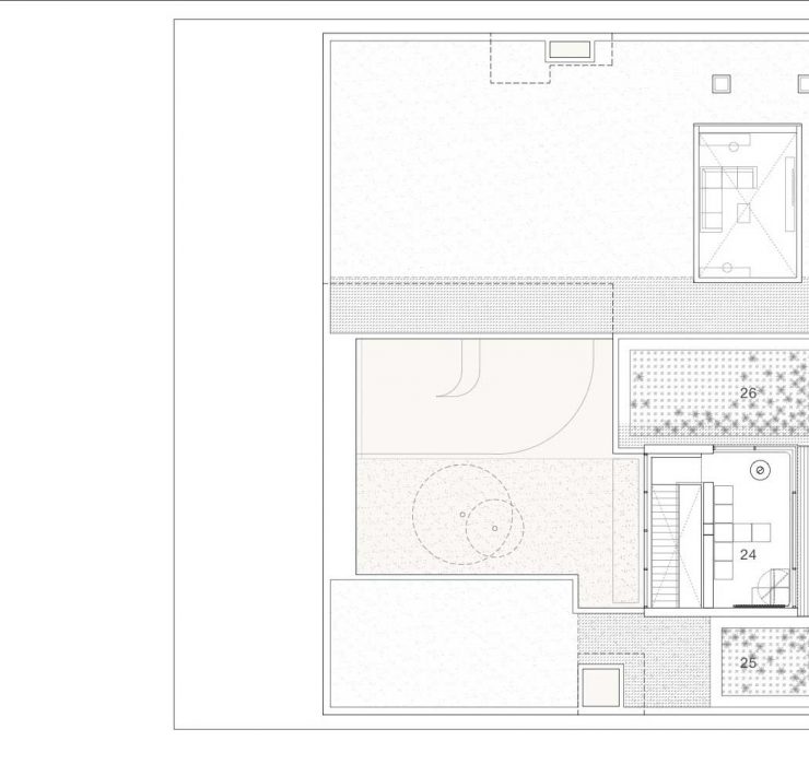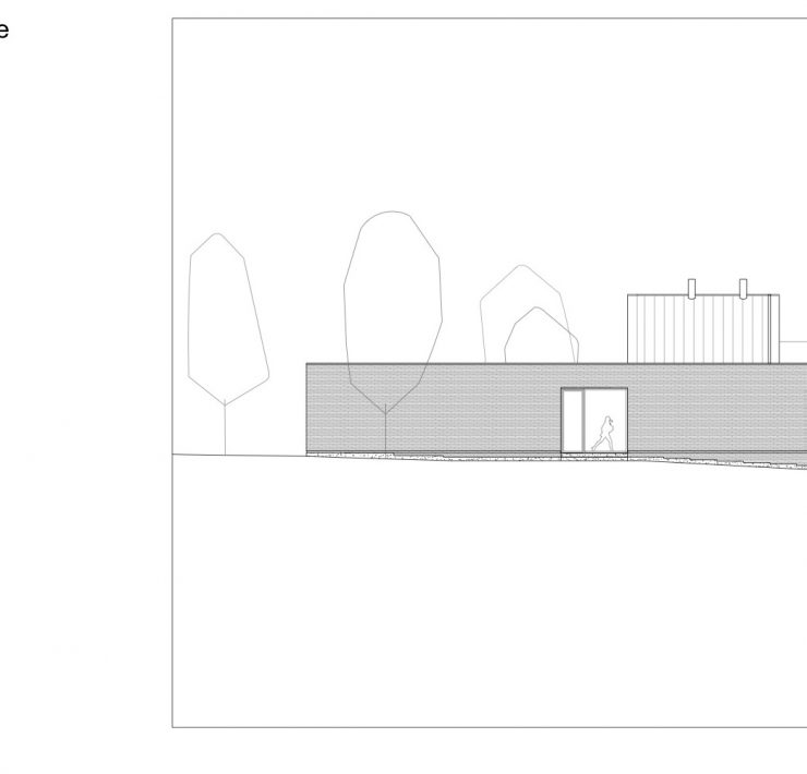 Sulla facciata anteriore, un grande bovindo e il soggiorno abbassato di alcuni gradini creano un flusso visivo verso la piscina e il fiume. L’asse nord-sud del progetto ospita gli spazi più intimi con necessità di privacy, mentre gli spazi sociali si trovano lungo il fiume, beneficiando così di un forte legame con il paesaggio circostante.
