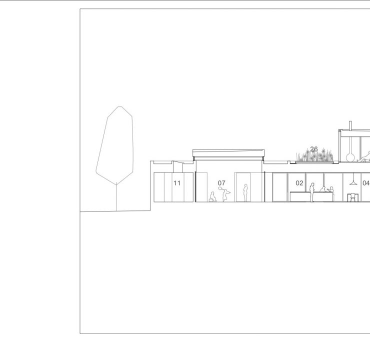 La distribuzione programmatica degli spazi interni tiene conto del rapporto con la strada e con il fiume, dell’orientamento solare e delle esigenze specifiche degli abitanti.