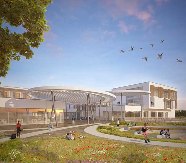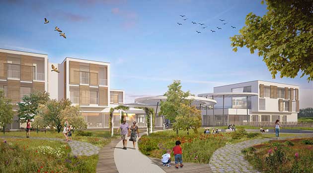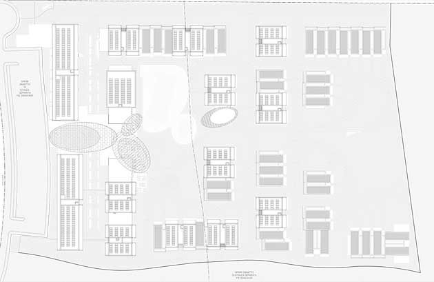 Siamo di fronte a un progetto leggero, minimalista eppure ricercato, in quanto sono assenti macchinari, volumi tecnici, autovetture, parcheggi, zone di carico e scarico delle merci. Assenti, sulle coperture inerbite degli edifici, gli impianti tecnici.