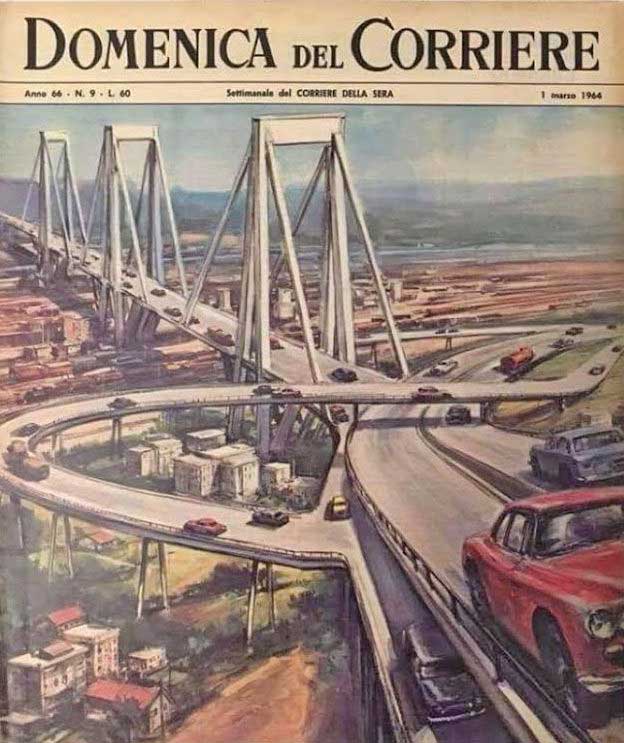 Nel 1964, tre anni prima del suo completamento, Walter Mollino celebrava con questa illustrazione sulla Domenica del Corriere il viadotto Morandi e le capacità dell´ingegneria italiana |
