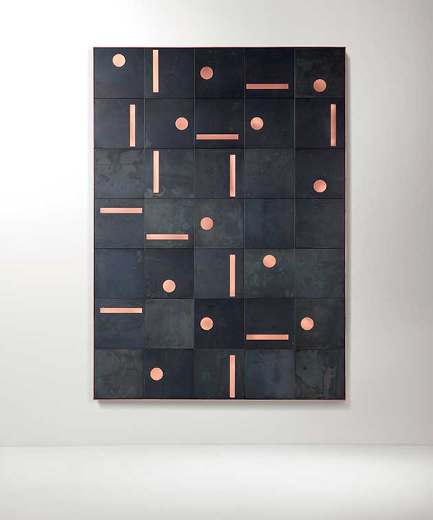 L’intarsio metallico di Yoko – prodotta da De Castelli su progetto di Leonardo Sonnoli, uno dei maggiori graphic designer contemporanei – abbatte i confini tra arte, grafica e decorazione d’interni.