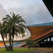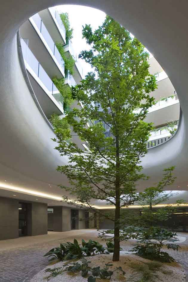 Due grandi alberi sbucano da due aperture ellittiche ricavate dal piano di copertura della corte interna (foto ©Moreno Maggi)