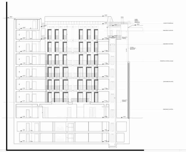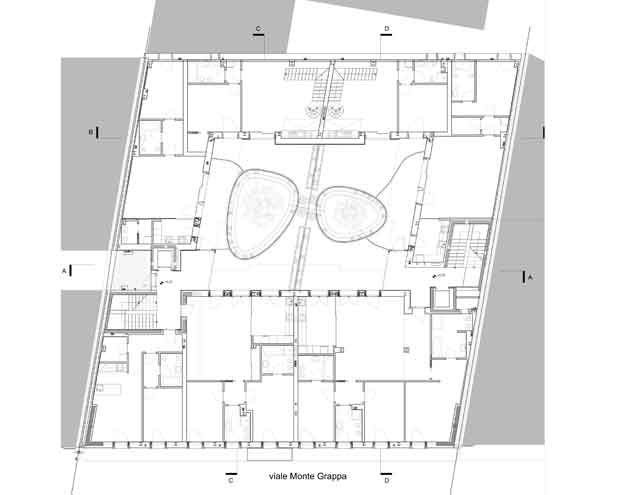 L’intervento ha previsto innanzitutto la demolizione del fabbricato originario, un edificio popolare realizzato nel 1882 ormai in gravi condizioni di degrado, riprendendo in fase di ricostruzione alcuni parametri compositivi originari: la tipologia a corte con residenze a ballatoio reinterpretata sui fronti interni, l’organizzazione della facciata principale su tre piani e la contiguità dei muri con gli edifici su viale Monte Grappa, le dimensioni della corte interna. Il fronte principale è definito da fasce orizzontali distinte per trattamento materico: bugnato cementizio, muratura a intonaco e un coronamento vetrato a doppia pelle inserito in una cornice in pietra, elemento che rompe il rigore della facciata ottocentesca originaria e rivela il carattere contemporaneo dell’intervento.