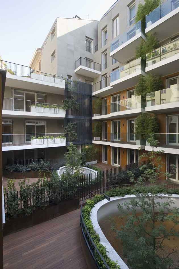 La corte interna è definita da corpi di diversa altezza e facciate caratterizzate da elementi aggettanti e da un rivestimento in legno fino al terzo piano e in pietra di Bedonia dal quarto al sesto (foto ©Moreno Maggi)