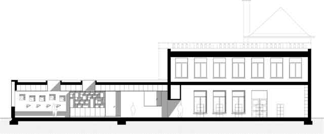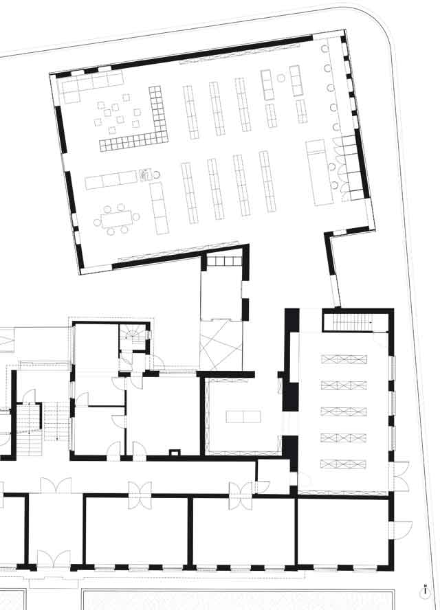 Subordinato al volume principale da un punto di vista dimensionale, l’ampliamento risulta visivamente scollegato da esso anche per quanto riguarda l’aspetto materico: le facciate infatti sono rifinite in pannelli di acciaio Corten che contrastano con i fronti intonacati di bianco dell’edificio storico. Inoltre, la posizione stessa dell’estensione enfatizza la tensione tra l’edificio storico e il nuovo volume, caratterizzato da grandi finestrature collocate agli angoli per garantire alla biblioteca la necessaria visibilità e un certo grado di interazione con l’ambiente urbano circostante.