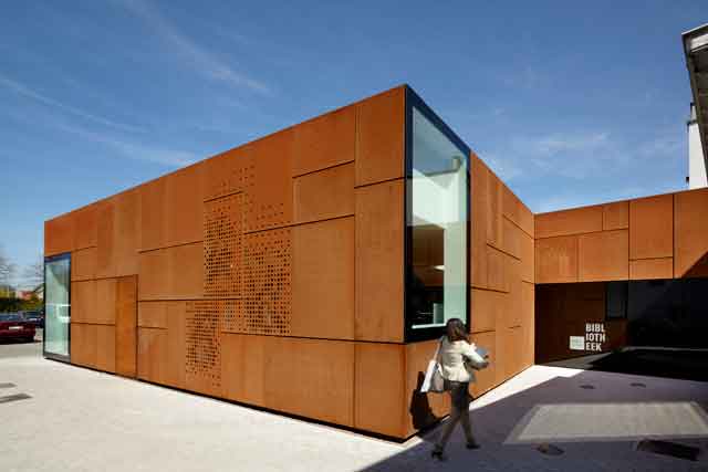 Subordinato al volume principale da un punto di vista dimensionale, l’ampliamento risulta visivamente scollegato da esso anche per quanto riguarda l’aspetto materico: le facciate infatti sono rifinite in pannelli di acciaio Corten che contrastano con i fronti intonacati di bianco dell’edificio storico. Inoltre, la posizione stessa dell’estensione enfatizza la tensione tra l’edificio storico e il nuovo volume, caratterizzato da grandi finestrature collocate agli angoli per garantire alla biblioteca la necessaria visibilità e un certo grado di interazione con l’ambiente urbano circostante.