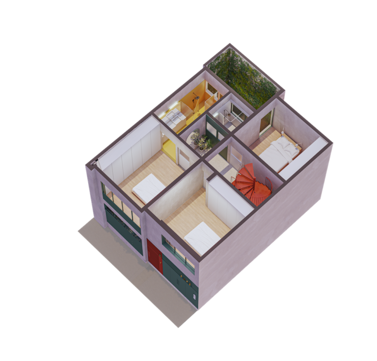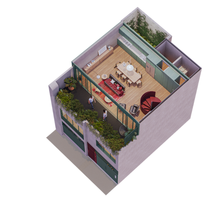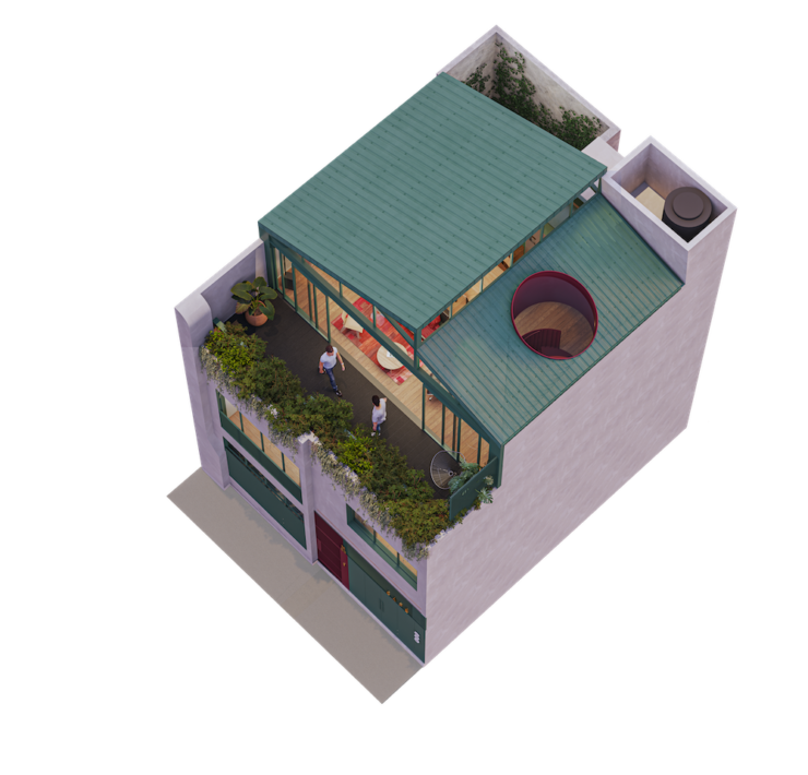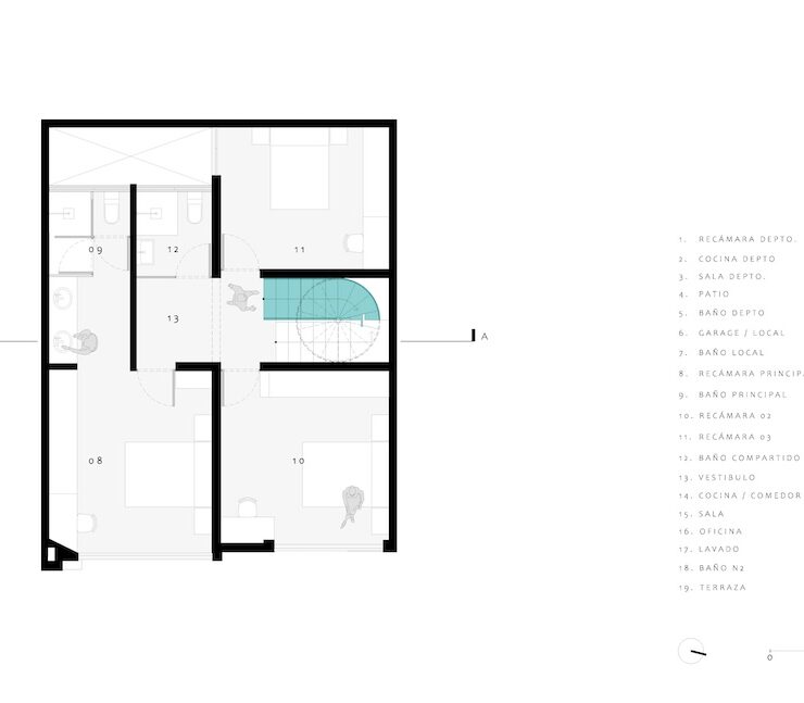 Il progetto architettonico parte da un approccio tipologico e strutturale integrato. L’obiettivo è duplice: conservare l’involucro originale e ottimizzare l’uso funzionale degli spazi. Per garantire la sostenibilità economica dell’intervento, AmasA Estudio ha introdotto un programma misto articolato su tre unità distinte, accessibili da un vestibolo comune al piano terra: un appartamento indipendente (con camera, bagno, soggiorno con cucina e patio); un locale con servizio utilizzabile come garage o spazio commerciale; la residenza principale, che si sviluppa su due livelli.