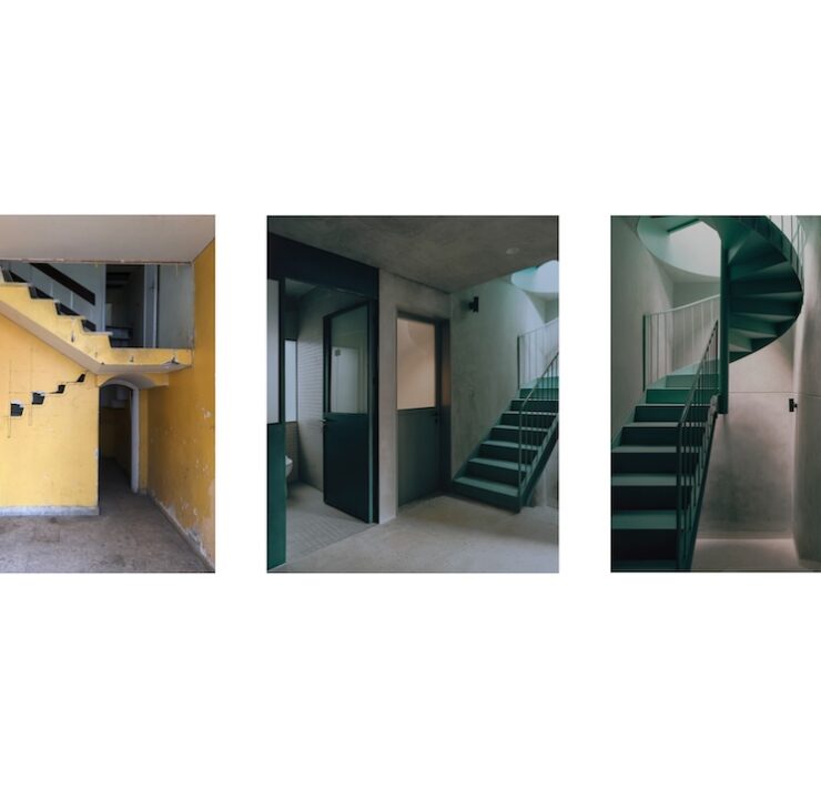 Sul piano dei materiali, l’intervento punta alla coesistenza tra elementi nuovi e preesistenze: una struttura metallica verniciata in verde – che ricorre in scale, infissi e arredi fissi – dialoga con intonaci grigi e finiture semplici, generando una tavolozza coerente e misurata. Le scelte cromatiche amplificano l’effetto della luce naturale e restituiscono profondità agli spazi.
