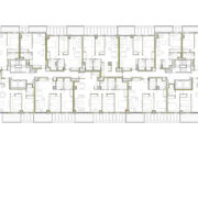 La distribuzione delle abitazioni è ottenuta mediante l’alternanza di tipologie simmetriche ai piani pari e dispari, cercando di ottimizzare la superficie edificata per dotare il complesso di una maggiore superficie di aree e spazi comuni al pianoterra e al seminterrato, che includono spazi come piscina, area sportiva e un’area giochi esterna coperta o area sportiva interna.