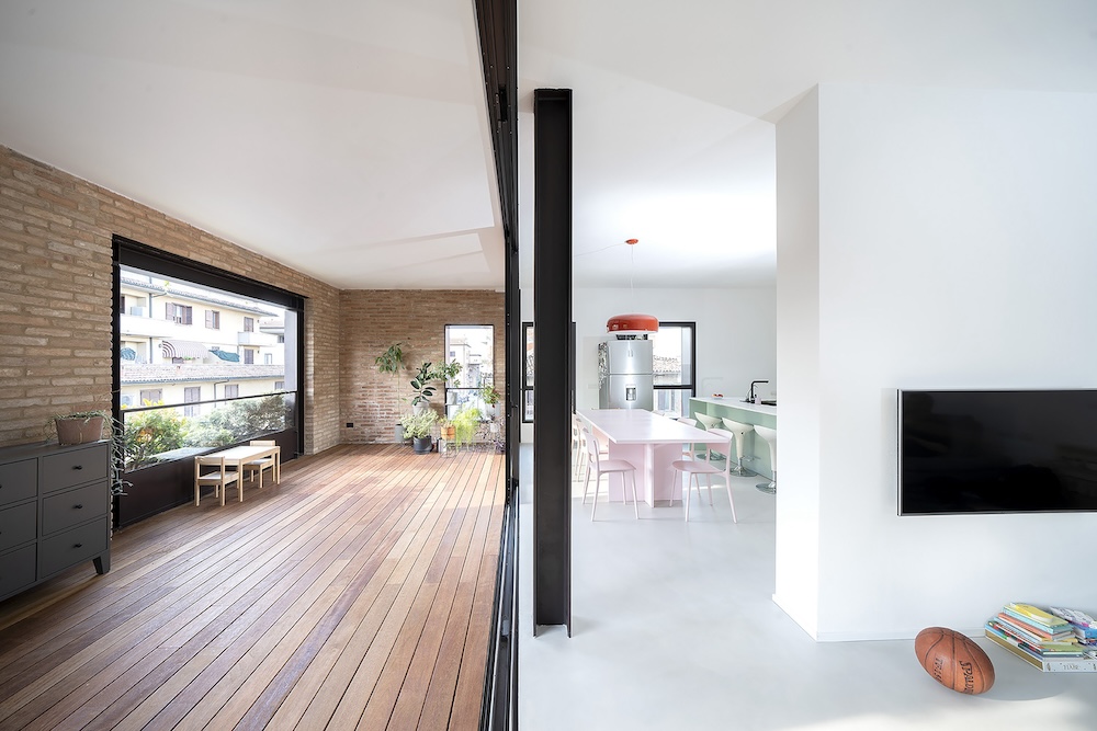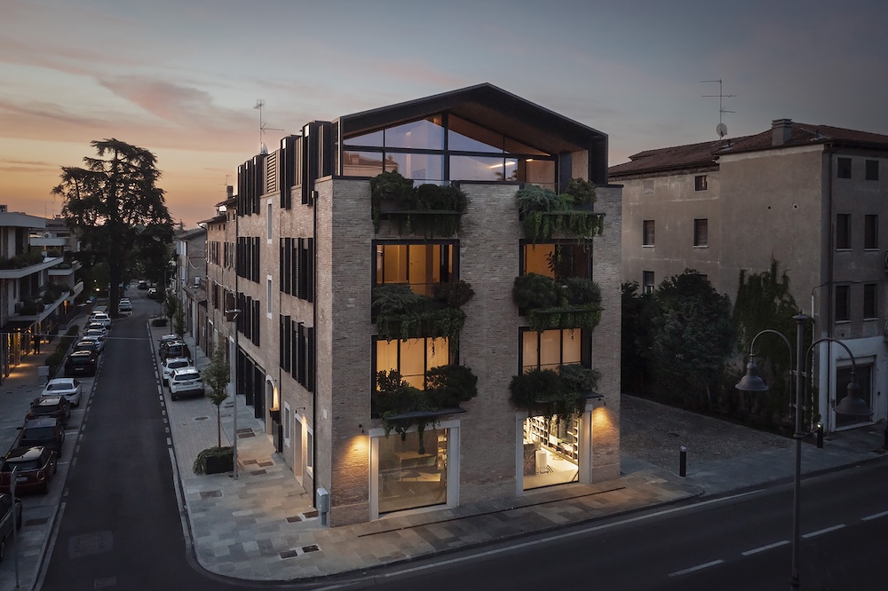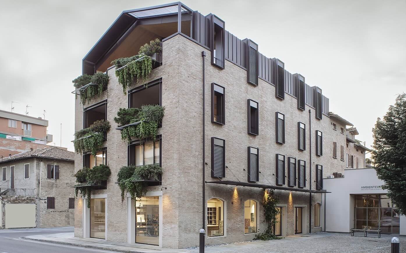 Un esempio efficace è l’intervento di riqualificazione delle Ex Officine Tosi a Formigine (Modena), firmato dallo studio Ambientevario. Il progetto lavora su una sovrapposizione dichiarata tra preesistenza e nuova architettura: il mattone a vista conserva la memoria industriale, mentre la sopraelevazione e le nuove aperture introducono una stratificazione contemporanea leggibile.