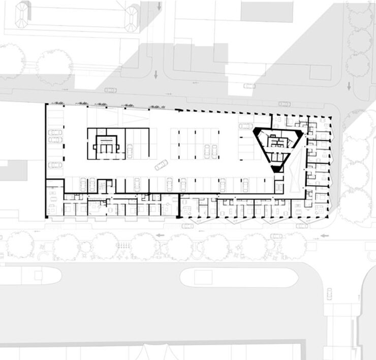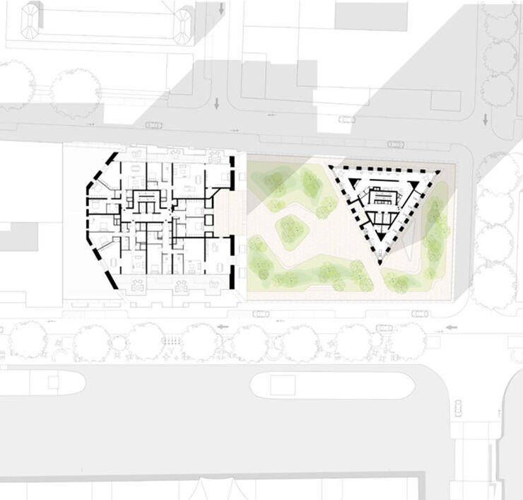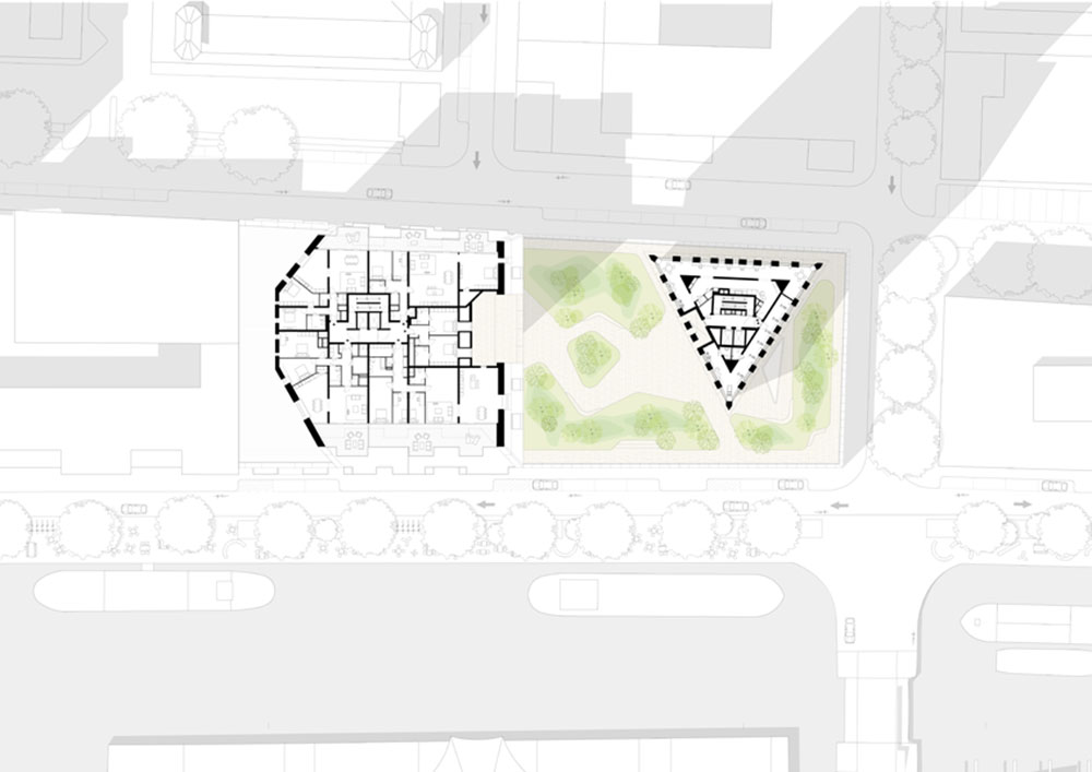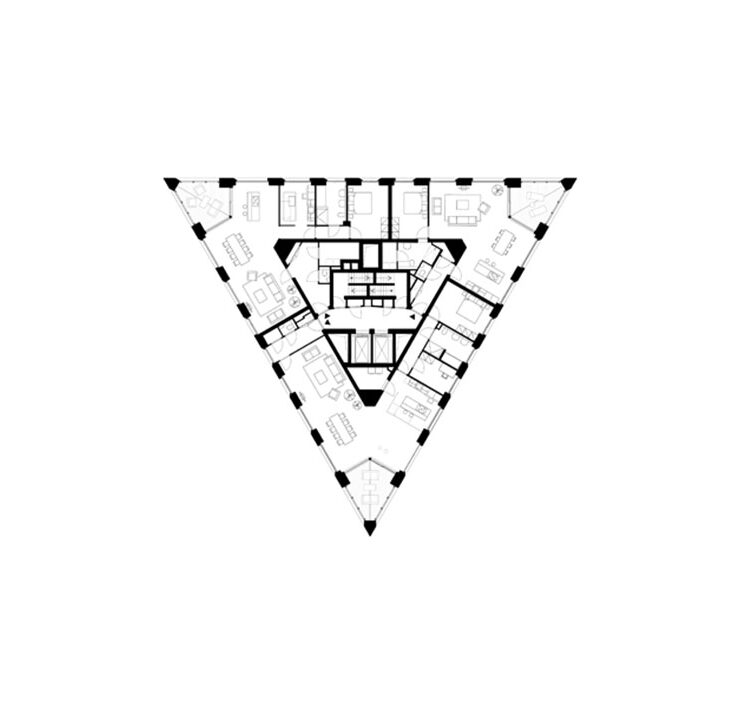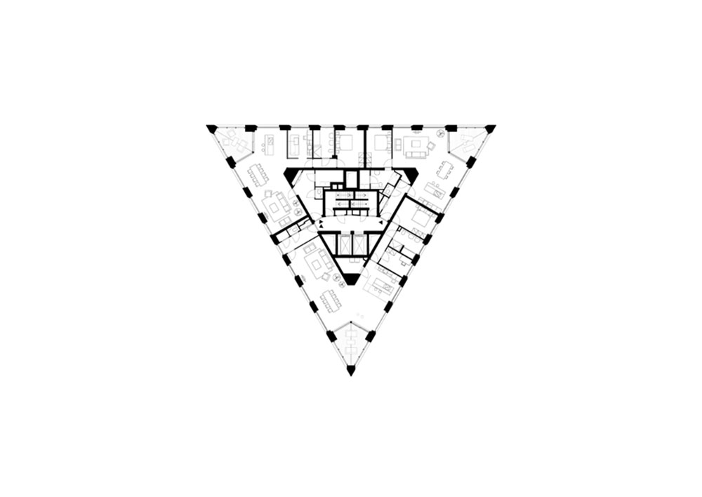 La forma insolita regala agli appartamenti ampie viste sulla città e sull’acqua. Agli angoli del prisma triangolare si trovano generose logge di 15 metri quadrati, pensate come un prolungamento dello spazio abitativo. L’inedita forma inoltre migliora l’esposizione delle tre sole facciate alla luce solare.