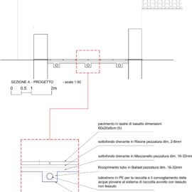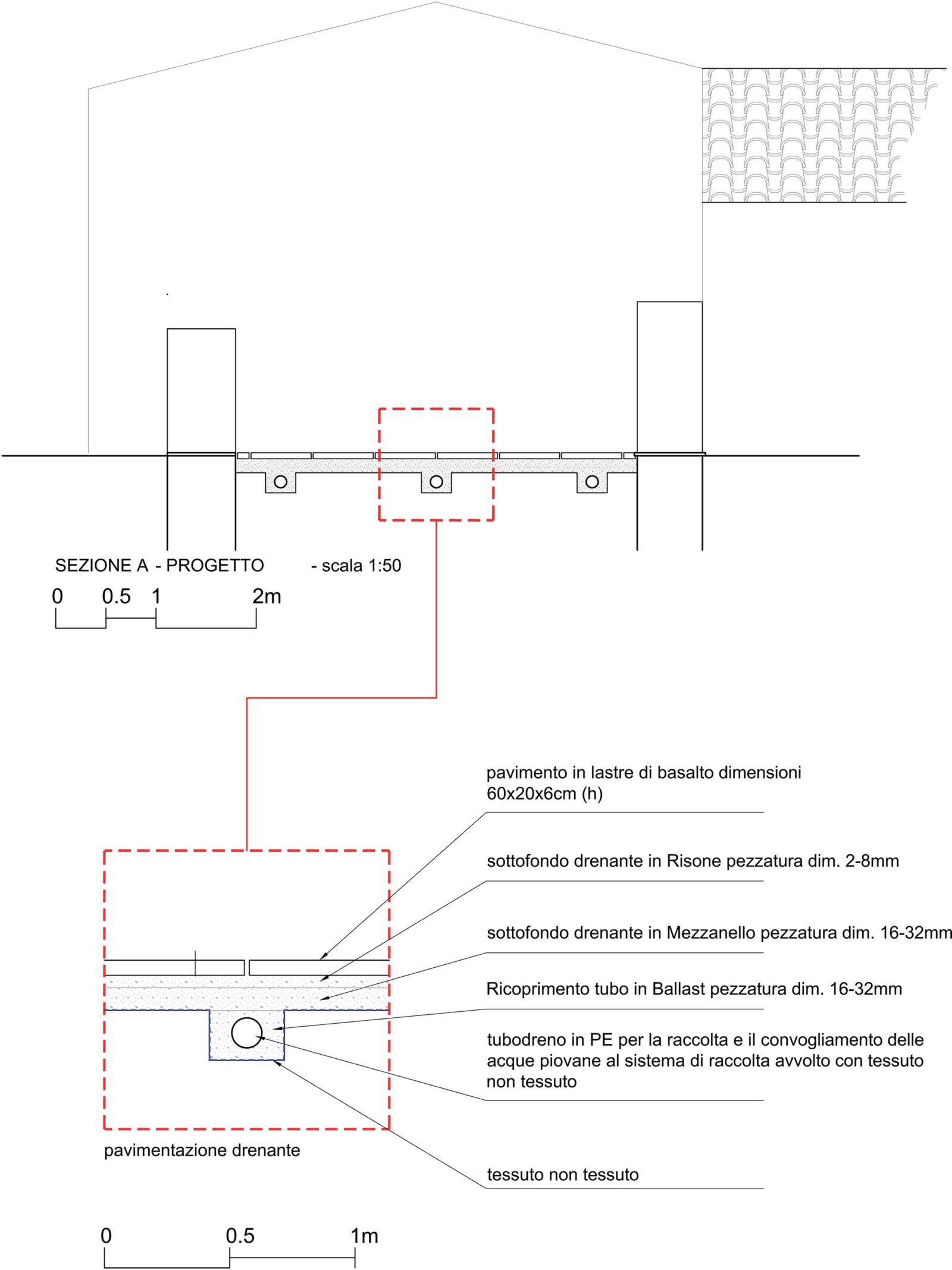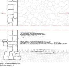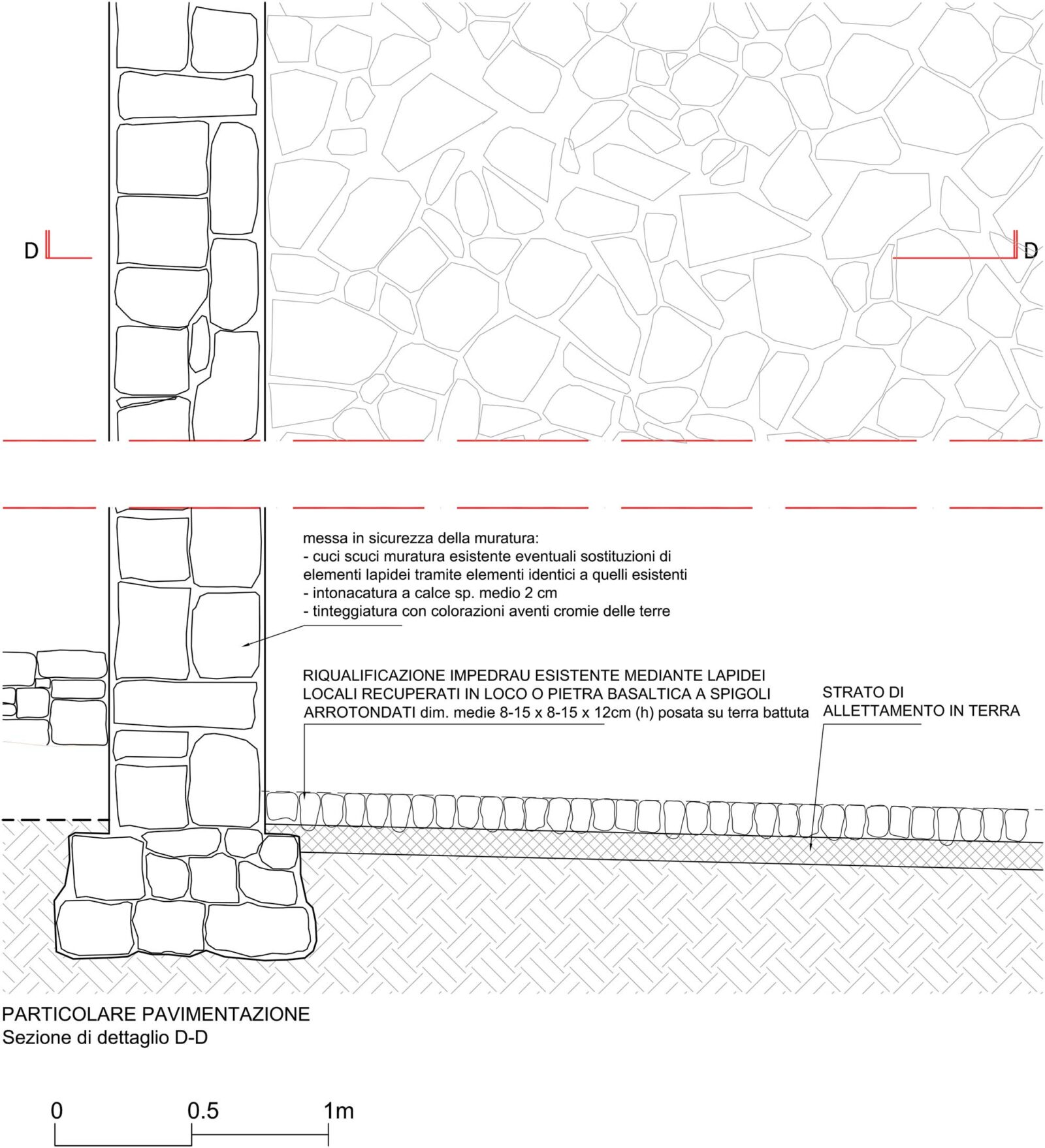 Le quali a loro volta, dopo le operazioni di pulizia e la rimozione delle macerie, sono state trattate mantenendo la modalità utilizzata nei vecchi spazi aperti, con la tipica pavimentazione a “impedrau”, mentre all’interno dei vecchi vani residenziali, ora stanze a cielo aperto, è stata inserita una pavimentazione lapidea come le vecchie “tellas” di pietra, resa permeabile con una posa a fughe larghe su un letto di risone steso sopra una rete di tubi drenanti.