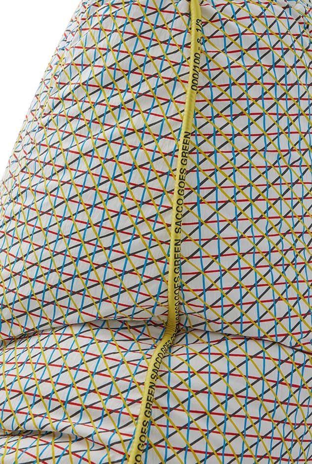 La collezione numerata Sacco Goes Green si compone di tre serie da 100 esemplari ciascuna che si differenziano per il pattern su disegno di Pierre Charpin. Il designer francese si è ispirato al concetto di ‘rete’ per creare un fitto intreccio di linee colorate, proposto in tre varianti cromatiche, che asseconda tutte le configurazioni di Sacco senza modificare l’effetto del disegno.
