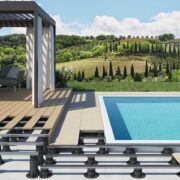 Sono molti gli elementi della tradizione locale che entrano in gioco nel progetto. Il colore e i materiali creano punti di contatto fra antico e nuovo: i tetti a falde in legno sono stati coperti con antichi coppi recuperati e il colore rosa delle murature restituisce l’atmosfera tipica della campagna mediterranea.