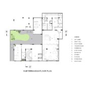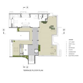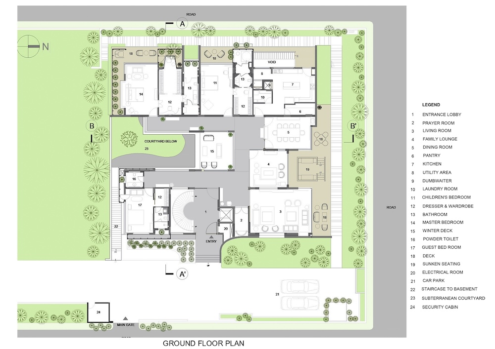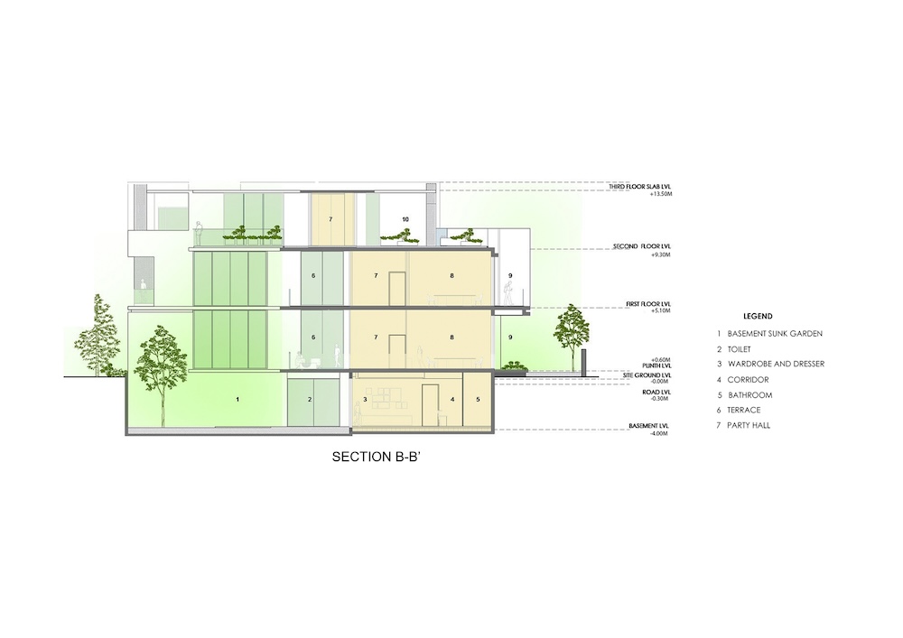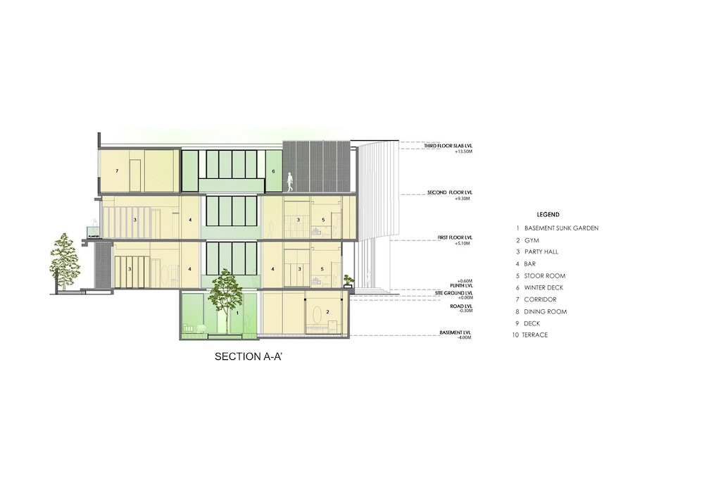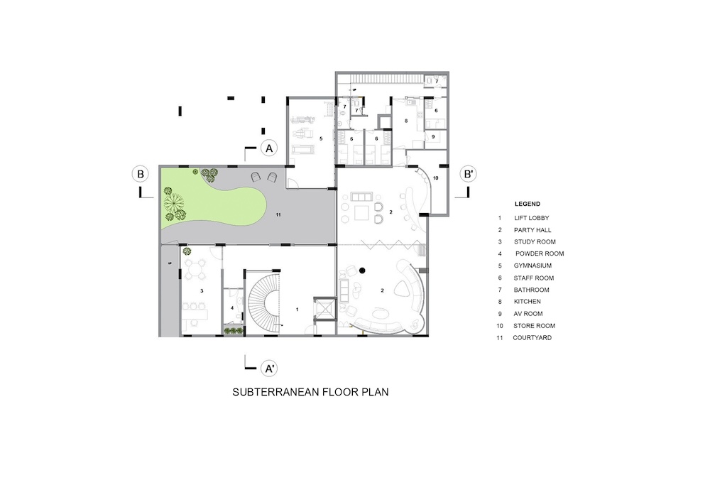 Il livello sotterraneo, che riceve luce naturale da un cortile ribassato, ospita un ampio salone, una palestra e aree di servizio.