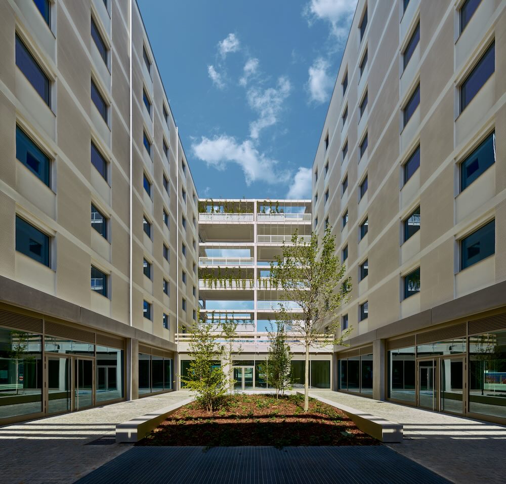 Gli edifici, certificati Leed Gold e Wiredscore Platinum, sono a zero emissioni operative grazie a pompe di calore energeticamente alimentate da un parco fotovoltaico da 1 MW, sistemi di recupero delle acque e illuminazione intelligente.