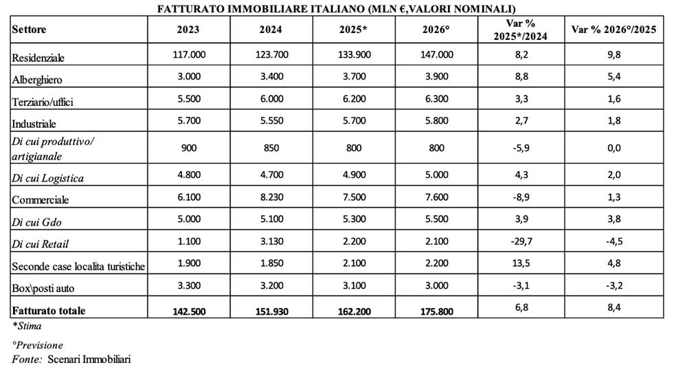 Dopo un 2025 che si dovrebbe chiudere con un fatturato superiore ai 162 miliardi di euro (+6,8 per cento sul 2024), le stime del mercato immobiliare italiano per 2026 indicano un nuovo balzo in avanti a oltre 170 miliardi di euro, con un incremento  dell’8,4%.