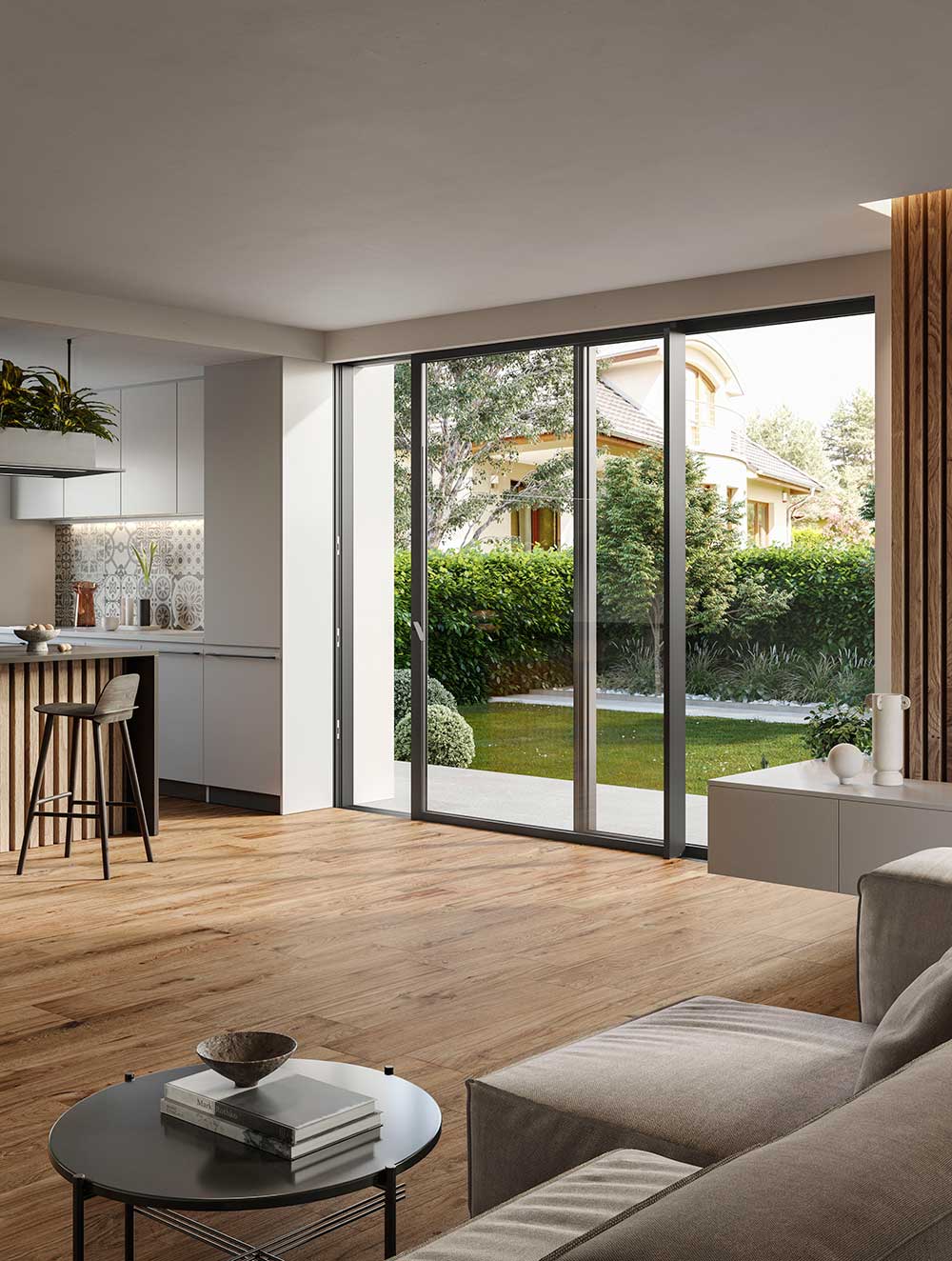 Dal punto di vista del design, profili estremamente snelli consentono di inserire con discrezione lo scorrevole in qualsiasi contesto architettonico, per dar vita ad ampie superfici vetrate e trasparenti, con ambienti luminosi, che aumentano il comfort abitativo.