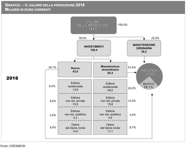 Positivi anche i dati dei primi nove mesi del 2016, che descrivono le compravendite immobiliari, il credito alle famiglie, la vendita di finiture e impianti, la vendita di macchine movimento terra. Non ci sono invece segnali positivi dalla nuova produzione residenziale che continua a frenare: nel 2016 gli investimenti in nuove costruzioni sono di poco superiori all’8% del valore della produzione dell’intero mercato delle costruzioni.