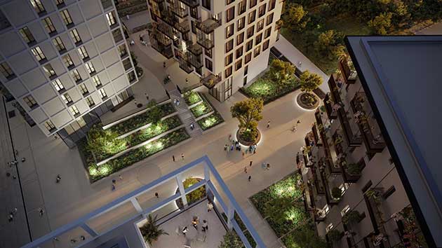 I palazzi più alti saranno collocati sul fronte rivolto verso la città, con i primi due piani occupati dalle hall di ingresso, da attività commerciali e, al piano primo, aree comuni condominiali: area living e cucina sociale, sala polivalente per feste, spazi di coworking, palestra, area gioco bimbi, area smart delivery lockers, biblioteca degli oggetti e laboratorio di riparazione e riuso.