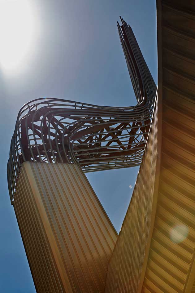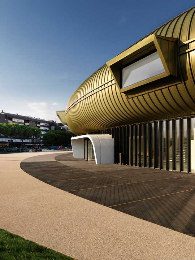 Il punto più alto del complesso espositivo è contraddistinto da un elemento simile a un’antenna, che qualcuno ha già definito “il piercing”, che alla funzione di landmark aggiunge il valore simbolico di ricettore della creatività presente sul territorio.
