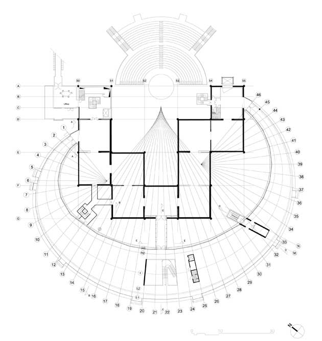 Trasparenza e opacità, concavità e convessità, masse leggere e masse gravi interagiscono creando un’atmosfera di curiosità che esorta all’esplorazione degli spazi, a una passeggiata guidata dalle differenze e allo stesso tempo dalle complementarietà. In cima all’anello, in posizione laterale rispetto all’asse di simmetria del complesso museale, si erge l’antenna che è il simbolo della mission del Centro.