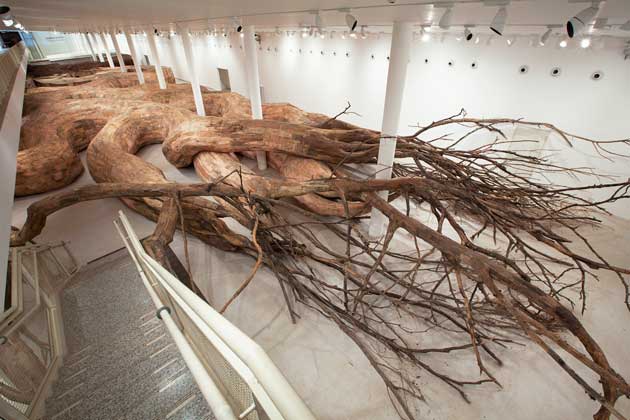 Henrique Oliveira, Transarquitetonica, 2014, Museu de Arte Contemporânea, São Paulo. Legno, mattoni, fango, bamboo, PVC, radici di alberi e altri materiali, 5 x 18 x 73 m. Photo Everton Ballardin |