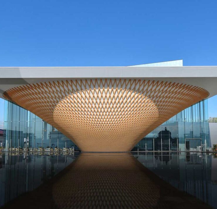 Durante la fase di progettazione, la tecnologia 3D ha aiutato a definire la forma esatta e il posizionamento delle circa 4.600 travi dell’involucro a griglia in legno. Con un sofisticato principio a incastro, le singole travi sono state adattate perfettamente l’una all’altra.