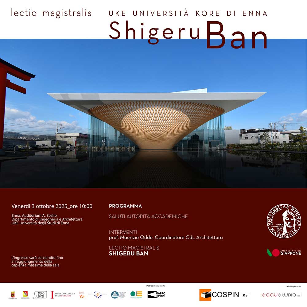 Venerdì 3 ottobre alle ore 10 presso l’auditorium del Dipartimento di ingegneria e architettura dell’Università Kore a Enna, introdotta dal professor Maurizio Oddo, è in programma una lectio magistralis dell’architetto giapponese e Premio Prizker Shigeru Ban.