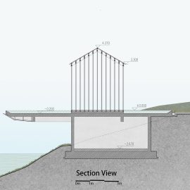 La base della stazione è a sbalzo per far emergere la nuova struttura dal contesto, risultando prominente rispetto all’ambiente circostante e ricreando un particolare effetto galleggiante, sia dalla prospettiva della strada che dalla superficie dell’acqua.
