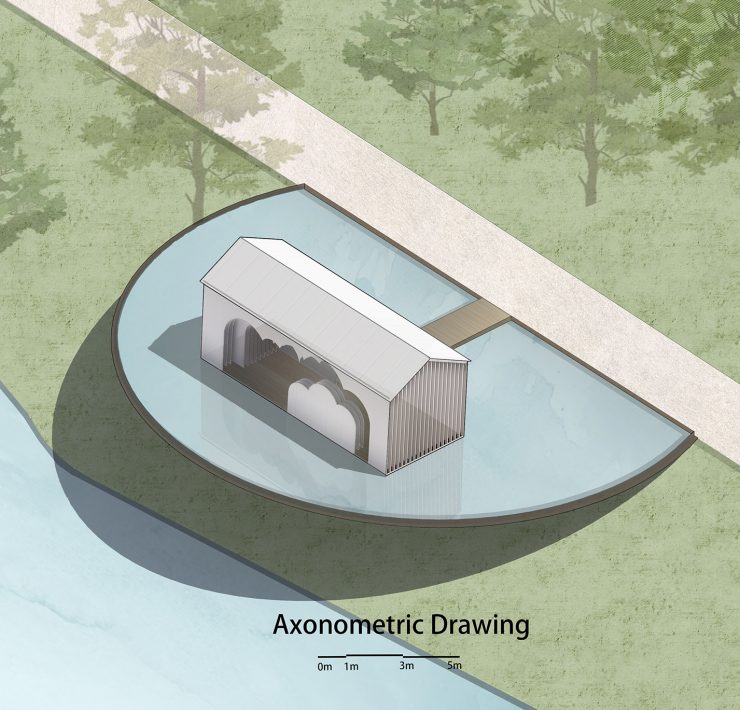 Sono la traslucenza e lo specchio d’acqua che lo isola il paesaggio a creare la sacralità del luogo. La possibilità di accedere al piccolo padiglione come se si entrasse in un santuario, plasmato dai ricordi condivisi della gente comune, ne amplifica il significato solenne.