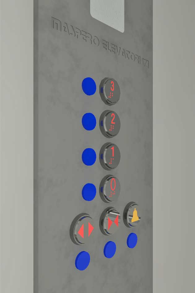 | La bottoniera magnetica messa a punto da Maspero Elevatori si installa accanto a quella tradizionale, che i non vedenti possono continuare ad usare con rischi minori dato il minor uso che ne viene fatto |