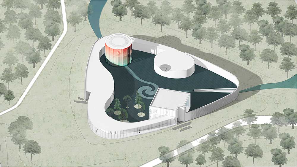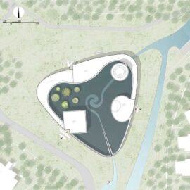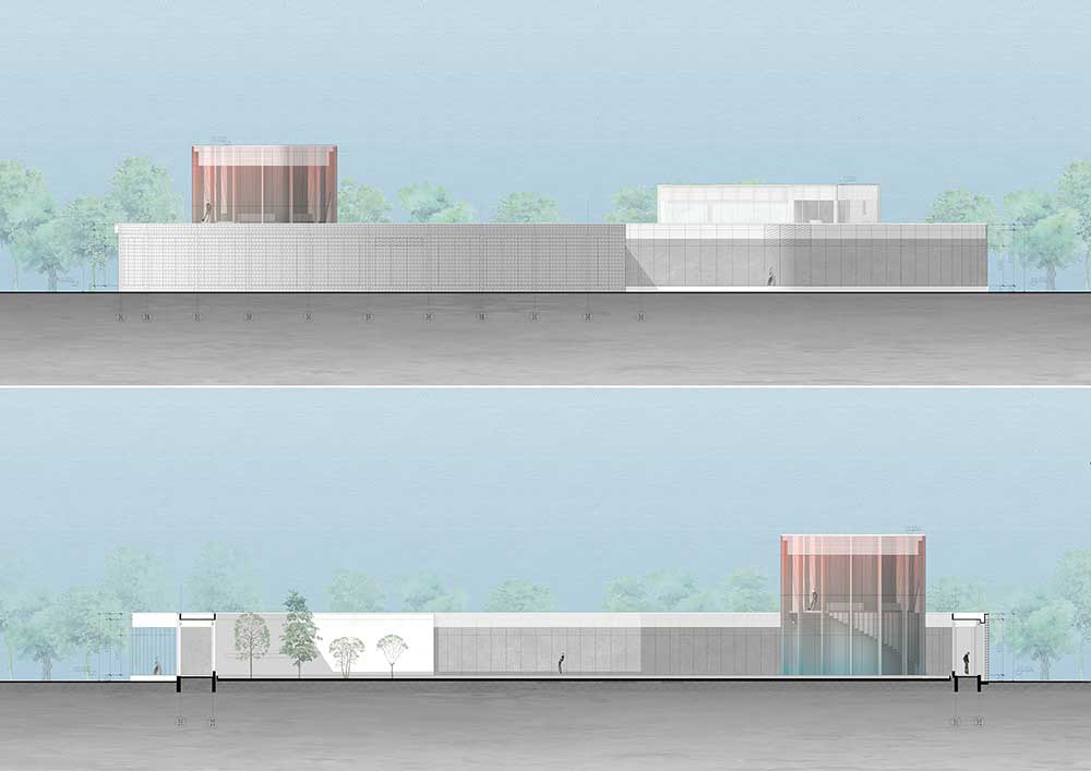 Con linee curve che abbracciano l’intero lotto, il Monologue Museum si sviluppa a partire dal perimetro esterno, con una recinzione porosa che si prolunga, come le pennellate della pittura e della calligrafia cinesi tradizionali, nello spazio luminoso della galleria d’arte, percorrendo il quale la vista si allarga sullo specchio d’acqua che forma la corte interna del museo.