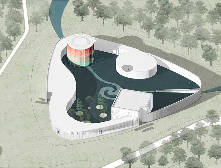 I volumi si sviluppano intorno allo specchio d'acqua della corte interna. Da sinistra lo spazio della danza, la galleria d'arte, il volume cilindrico della danza e il teatro (ph. ©CreatAR Images).