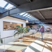 Ad esempio per quanto riguarda la lunga parete vetrata rivolta verso la corte interna: per ridurre il peso e le dimensioni degli elementi strutturali, la copertura è stata realizzata con un unico strato di 40 mm di calcestruzzo, con piastre di acciaio nervate in cima per garantire l’isolamento termico e l’impermeabilità.