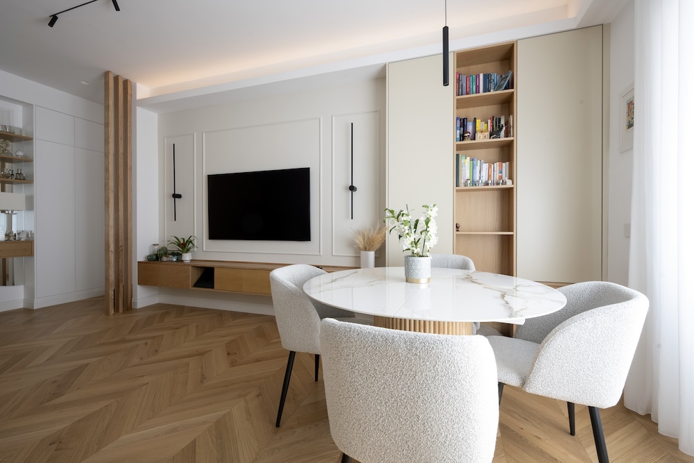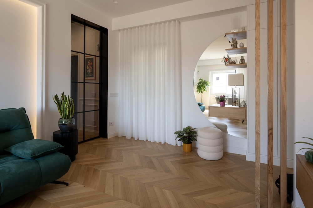 Fulcro visivo e funzionale dell’abitazione è stato il soggiorno, concepito come spazio bilanciato attorno a un asse prospettico che collegava idealmente ingresso e zona notte. Lungo questa direttrice si è sviluppata la posa del parquet Woodco Spina 45 Star in Rovere Naturale, calibrata con precisione per accentuare la geometria e la direzionalità degli ambienti.