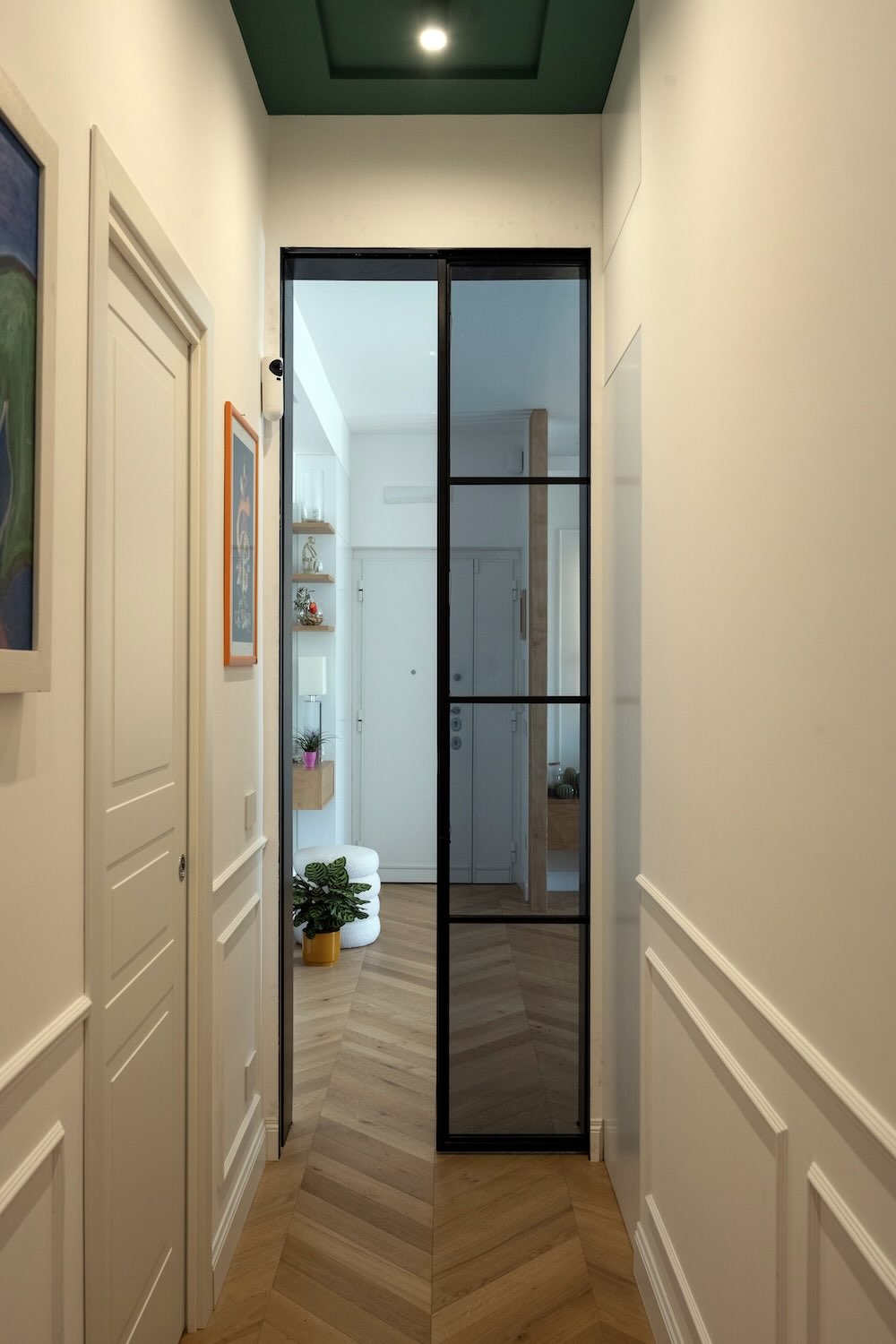 La posa del parquet a spina 45 di Woodco accompagna la prospettiva dell’ingresso, ph. ©Fabio Romano Montico.