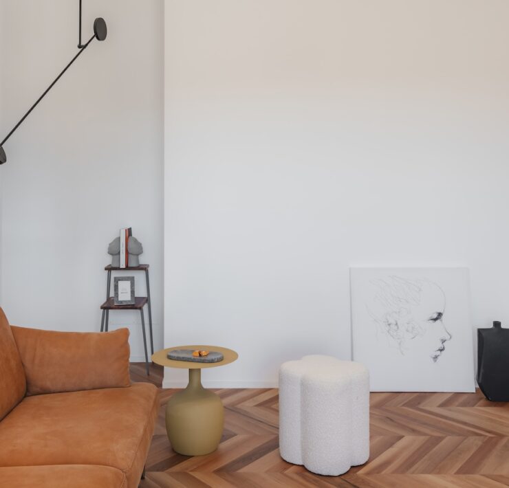 Fulcro visivo e funzionale dell’abitazione è stato il soggiorno, concepito come spazio bilanciato attorno a un asse prospettico che collegava idealmente ingresso e zona notte. Lungo questa direttrice si è sviluppata la posa del parquet Woodco Spina 45 Star in Rovere Naturale, calibrata con precisione per accentuare la geometria e la direzionalità degli ambienti.