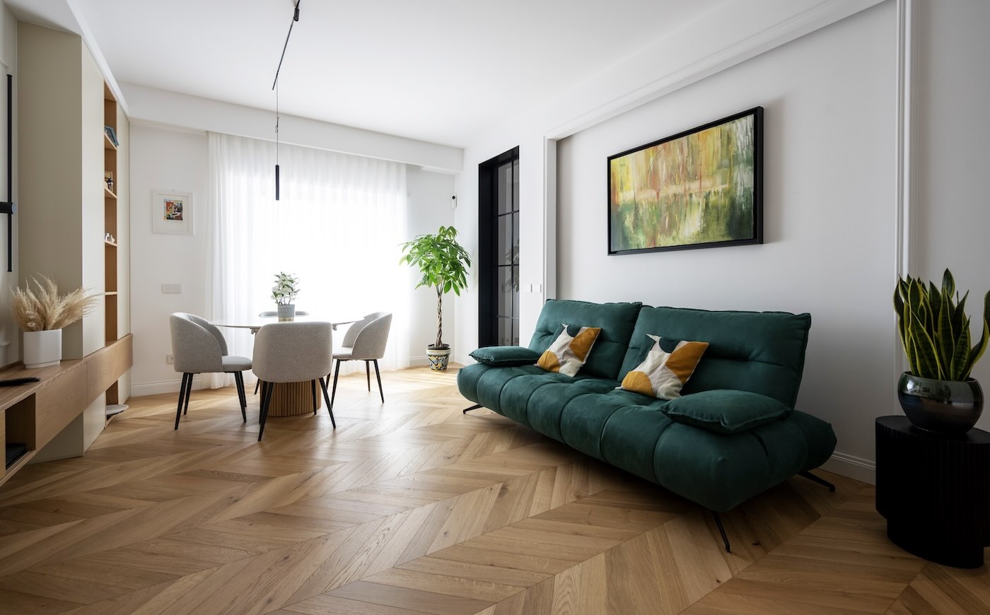 Il pavimento, rifinito con vernice opaca e abbinato al battiscopa Grand Ducale di Woodco laccato bianco, rappresenta il cardine compositivo dell’intervento, capace di unire continuità e calore materico. Le tonalità neutre del legno hanno dialogato con la falegnameria su misura e con i dettagli in verde bosco che caratterizzavano divano, soffitto del corridoio, rivestimenti del bagno principale e carta da parati della camera matrimoniale.