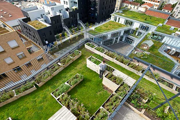 In sommità all´edificio di social housing è stato realizzato un grande tetto verde sperimentale. In totale, sono stati realizzati 400 mq di orti sui tetti e 550 mq di tetti verdi (foto, Mathieu Ducros/Michel Denancé) |