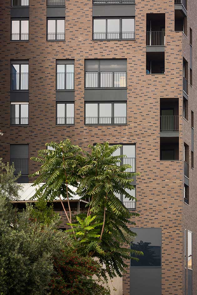 Le facciate rappresentano un gioco sottile e scultoreo di pieni e vuoti, luci e ombre. I tetti dei due edifici di proprietà ospitano orti urbani, giardini fioriti e pergolati per i residenti. Nei giardini, contenitori in legno aggiungono orti e verde coltivati privatamente agli spazi a giardino condominiali.