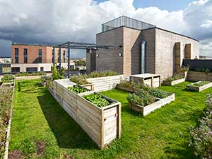 L´insieme di questi spazi favorisce gli incontri e la convivialità fra gli abitanti. In sommità all´edificio di social housing è stato realizzato un grande tetto verde sperimentale. In totale, sono stati realizzati 400 mq di orti sui tetti e 550 mq di tetti verdi.