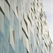 L’involucro è interamente rivestito in lastre ceramiche Laminam grigio “canna di fucile” di soli 6 mm di spessore, compresa la copertura, dove alle lastre sono applicate celle fotovoltaiche a film sottile del medesimo colore, coniugando produzione di energia da rinnovabili e bellezza architettonica. Si tratta della prima applicazione Laminam a una parete ventilata, che assegna al progetto anche un valore sperimentale: l’intelaiatura in alluminio che le sorregge è fissata a sua volta a listelli di legno annegati nei due strati di coibentazione esterna delle pareti portanti. Il test del recente sisma, superiore per intensità alla classe di pericolosità che la mappa nazionale assegna alla zona, è stato superato con usccesso anche grazie alla leggerezza strutturale celata sotto la forma massiva dell’asteroide padano.