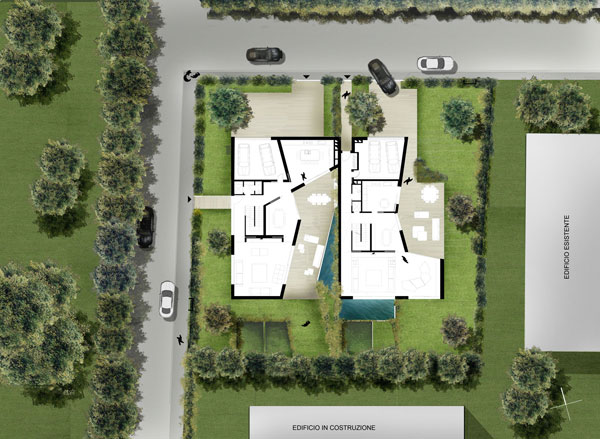 Un piano interrato ospita un’area wellness con piscine per ogni unità abitativa. Al piano terreno sono dislocati gli ambienti pranzo e soggiorno, con la pavimentazione realizzata in listelli di legno di varie dimensioni e ampie vetrate scorrevoli. Al piano superiore gli ambienti della zona notte, con parapetti in vetro che scorrono lungo un lato affacciato sul cortile interno di una residenza, e sul profilo di un lato esterno per l’altra abitazione. Gli ambienti interni si connotano qualitativamente per le loro relazioni spaziali, la ricerca di luminosità, l’orientamento ottimale. Il risultato è un equilibrato rapporto fra riservatezza, esposizione e accenti di luce, con una contrapposizione tra pareti in prevalenza opache e ampie aperture vetrate.