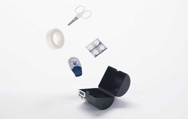 MINIM+AID il nuovo set di primo soccorso è fornito di un fischietto per avvisare gli altri della propria presenza, una radio con carica manuale che può anche essere utilizzata per ricaricare lo smartphone e altri dispositivi tramite USB, un impermeabile, una lanterna, acqua potabile in una bustina di carta stagnola collocata all’interno di un cilindro, utilizzabile come tazza, e un contenitore di plastica che può essere utilizzato per riporre medicine e altri oggetti. Il tutto confezionato all’interno di un tubo di 5 centimetri di diametro impermeabile e galleggiante.