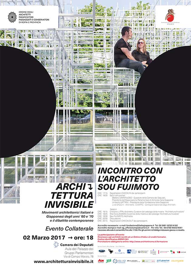 Sou Fujimoto, uno degli architetti protagonisti della mostra “Architettura invisibile” in corso al Museo Bilotti di Roma, giovedì 2 marzo terrà una conferenza presso la Camera dei Deputati a Roma.