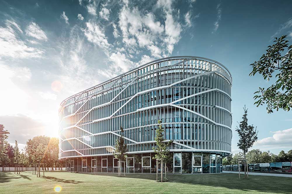 Il rivestimento esterno di questo ‘egg-in-a-box’ è in nastri di alluminio Prefalz in colore p.10 bianco Prefa, tagliati su misura per seguire accuratamente la geometria curvilinea della costruzione in acciaio dell’aula.